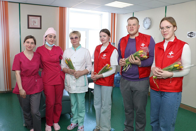 Подключились к акции и волонтеры-медики Архангельска. Они побывали в Северном медицинском клиническом центре имени Н.А. Семашко. Многие сотрудницы учреждения несут службу и в праздничный день. Добровольцы подготовили для медицинских работников праздничные букеты.